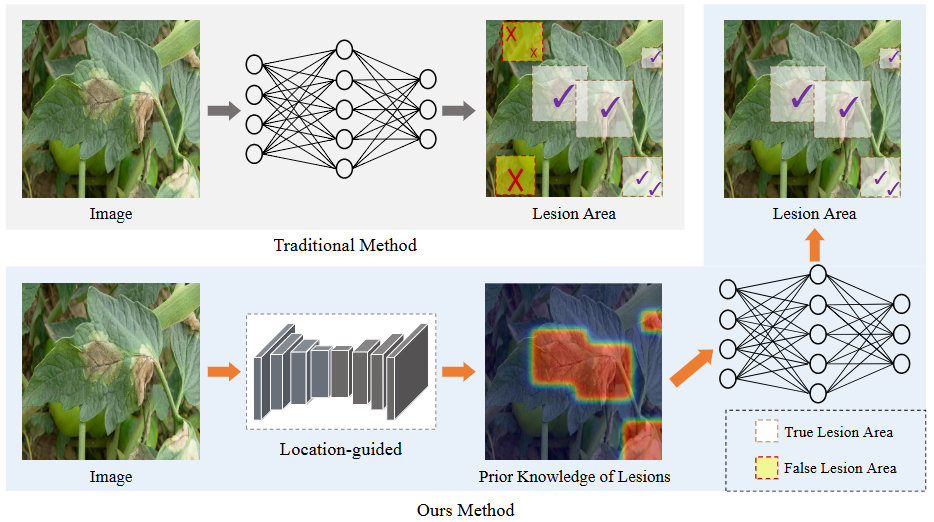 Figure 1: Comparison of existing deep learning methods and our approach. The true area indicates the correctly identified lesion, while the false area denotes misidentified lesions. Traditional methods rely on global learning, which often confuses background with lesion areas. In contrast, our approach utilizes location-guided to effectively eliminate background interference.