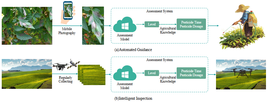 Figure 2: Practical applications of assessing the severity of plant leaf diseases. Including automated guidance, intelligent inspection, and expansion into fruit disease assessment. The figure illustrates (a) automated guidance and (b) intelligent inspection as examples.